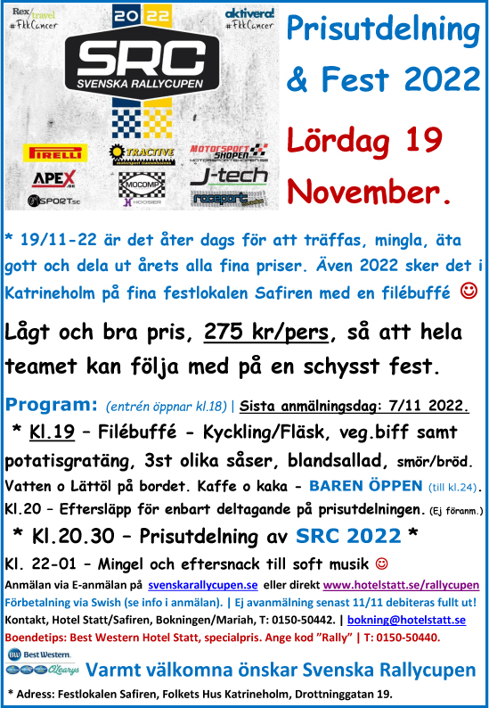 För någon vecka sedan tog Svenska RallyCupen 2022 målgång efter att Marknadsnatta avverkats över fem specialsträckor i dagsregn. Poängen summerades och inbjudan och anmälan för prisutdelning och festen den 19:e har varit öppen ett tag och det finns chans för fler att anmäla sig. Safiren i Katrineholm håller anmälan öppen fram till torsdag morgon, 10:e november klockan 8:00.