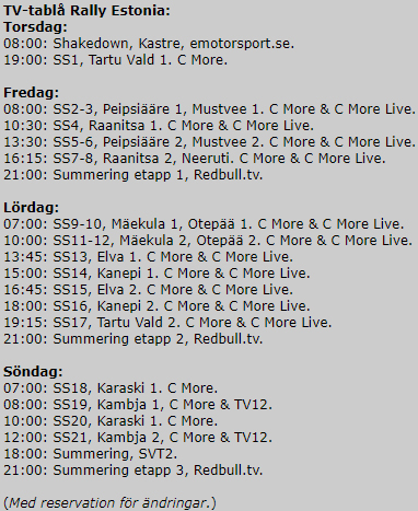 På torsdag startar Rally Estonia, 30 mil snabba grusvägar ska avverkas av VM åkarna, shakedown torsdag morgon och första publiksträckan på kvällen, sedan rullar det på med sträckor fram till söndag eftermiddag när rallyt tar målgång.