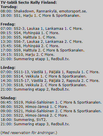 Till helgens körs det Finska VM rallyt, nionde deltävling för säsongen av de totalt 13 deltävlingarna. Rallyt inleds med shakedown torsdag morgon som kan ses i vår WebTV & Video avdelning. På kvällen startar rallyt med publiksträckan inne i Jyväskylä.